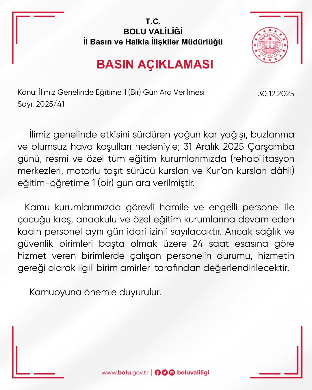 Olumsuz hava koşulları nedeniyle Düzce'nin Yığılca ilçesinde tüm eğitim kurumlarında 31 Aralık Çarşamba günü eğitime ara verildi. Valilik açıklamasına göre, merkez ile Kaynaşlı, Cumayeri, Çilimli, Gümüşova ve Gölyaka ilçelerinde ise sadece taşımalı eğitim kapsamındaki öğrenciler yarın ders yapmayacak.