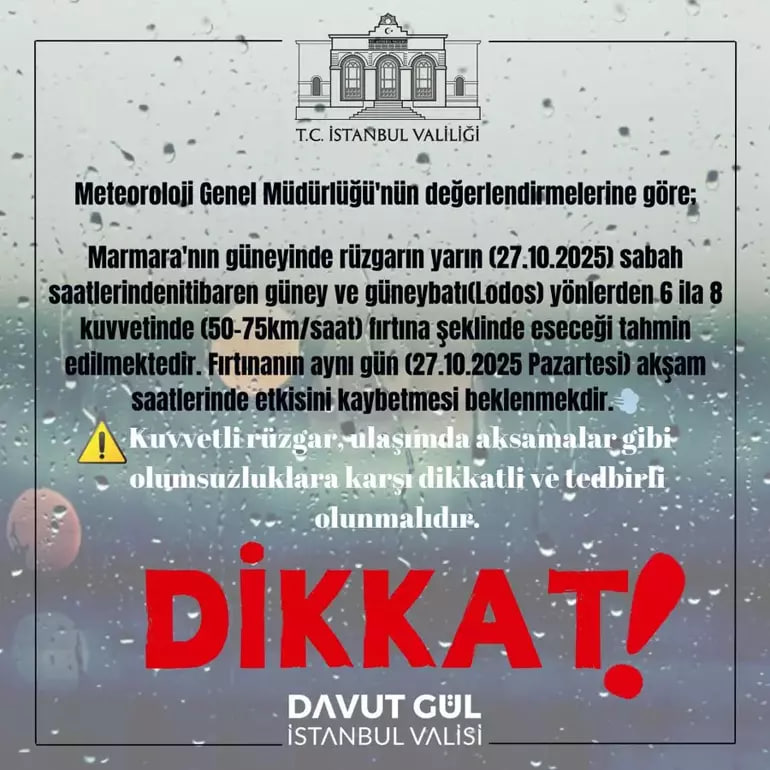 İstanbul Valiliği, Pazartesi günü sabah saatlerinden itibaren Marmara Bölgesi'nin güneyinde kuvvetli lodos beklendiğini açıkladı. Valilikten yapılan duyuruda, rüzgarın güney ve güneybatı yönlerinden saatte 50 ila 75 kilometre hızla eseceği ve akşam saatlerinde etkisini kaybedeceği bildirildi.