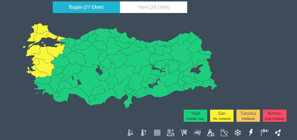Meteoroloji Genel Müdürlüğü (MGM), Marmara Bölgesi'nde yer alan 10 il için sarı kodlu uyarı yayımladı. MGM, Marmara ile Kuzey Ege'de bugün öğle saatlerinden itibaren fırtına beklendiğini açıkladı. Uyarıya göre bölge genelinde kuvvetli yağış, kısa süreli fırtına ve yer yer gök gürültülü sağanak etkili olacak.