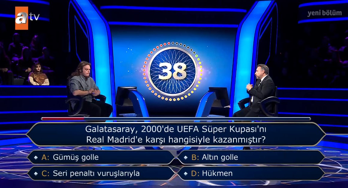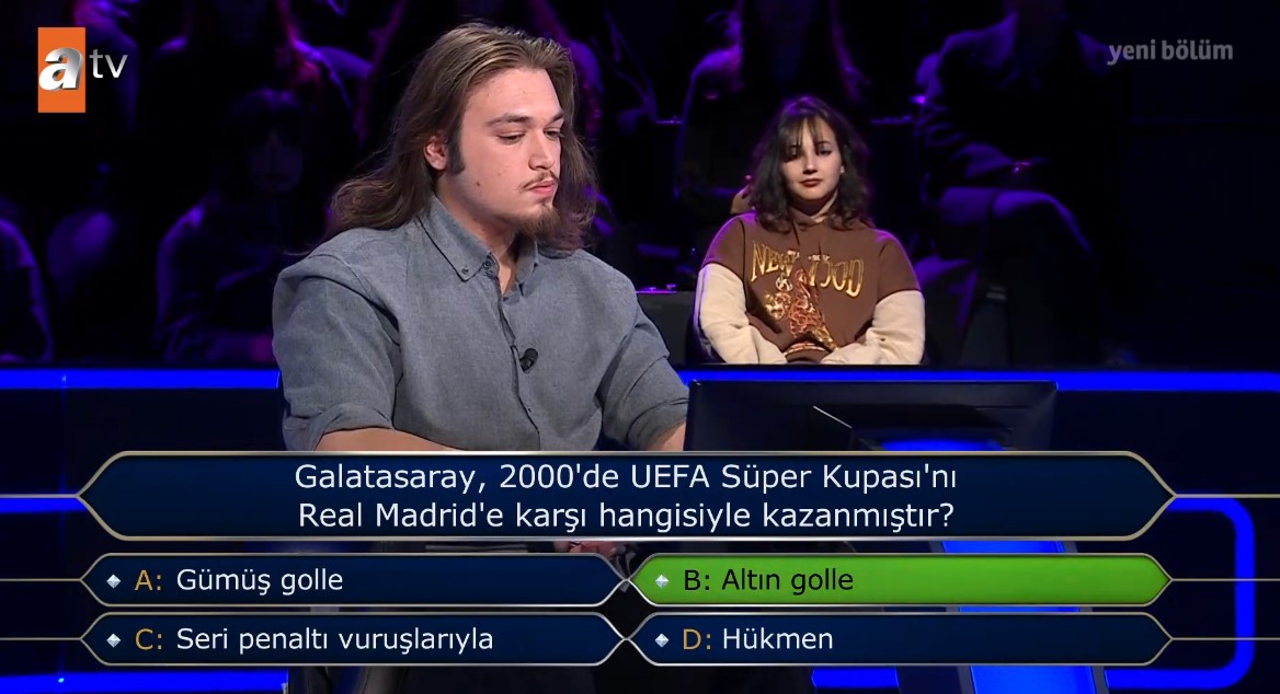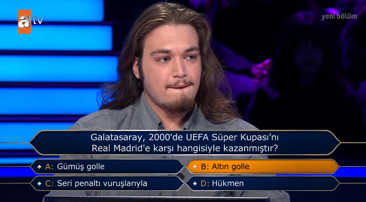Ekranların en çok sevilen programı Kim Milyoner Olmak İster her hafta olduğu gibi bu hafta da milyonlarca izleyiciyi ekran başına kilitledi. Birbirinden eğlenceli yarışmacıların katıldığı programda bugün Galatasaray sorusu yarışmanın en çarpıcı noktalarından biri oldu. 20 yaşındaki üniversite öğrencisi Necip Can Aslan, Galatasaray ve UEFA Süper Kupası'nın geçtiği o soruda heyecan dolu anlar yaşadı. Galatasaray taraftarlarının ekrana kilitlendiği anlarda Aslan, o soruda telefon joker hakkı kullandı. İşte o soru ve Milyoner'de yaşananlar...