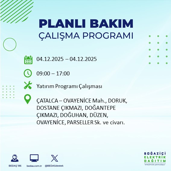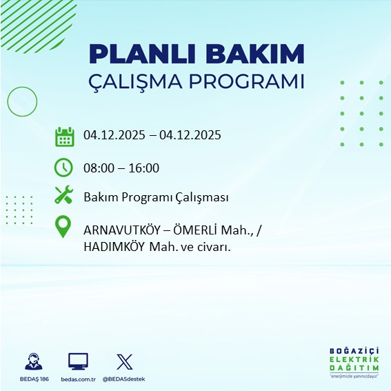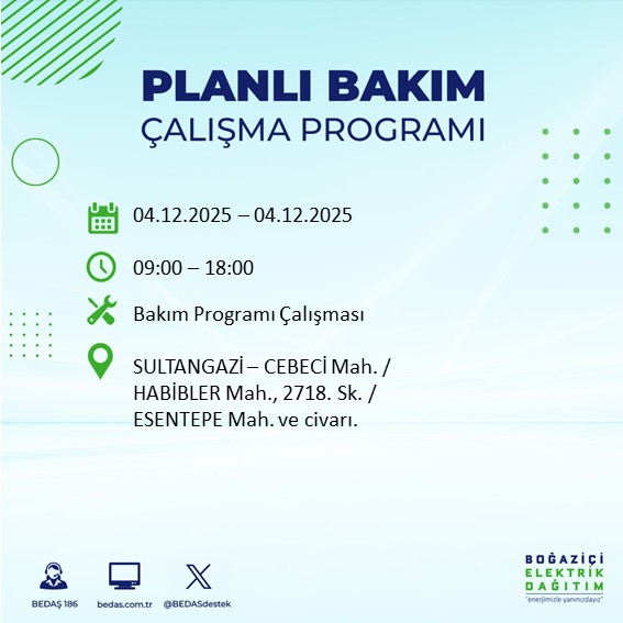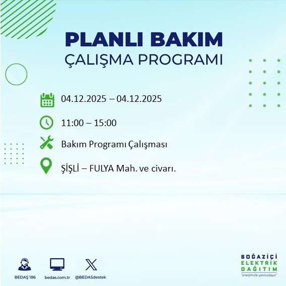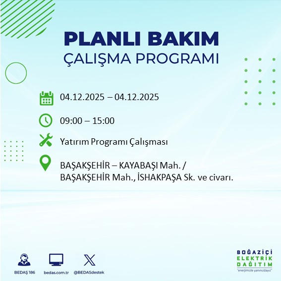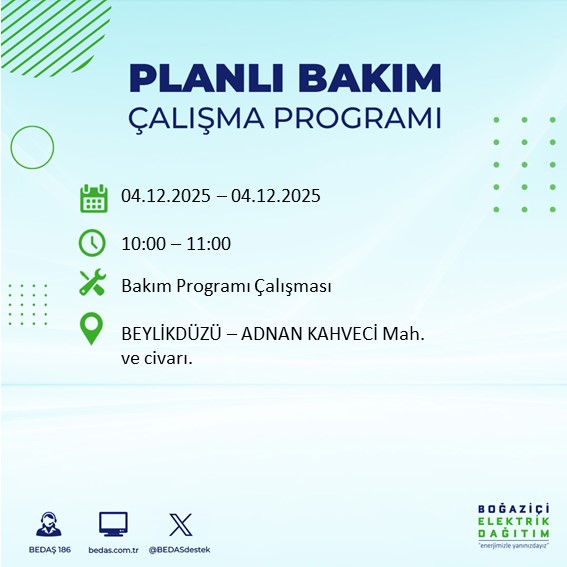 BEDAŞ'ın her gün resmi internet sitesinde yayımladığı duyurular kapsamında, 4 Aralık tarihli planlı kesinti programı da belli oldu. Bu tarihte özellikle teknik çalışma gerektiren bölgelerde elektriğin uzun süreli olarak kesilebileceği belirtildi.