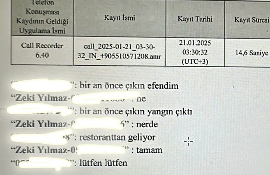 Bolu'daki Grand Kartal Otel'de 78 vatandaşın can verdiği faciaya ilişkin yeni detaylar ortaya çıkmaya devam ediyor. 133 kişinin yaralandığı yangın faciasına ilişkin dava sürerken dikkat çeken bir gelişme yaşandı. Grand Kartal Otel Müdürü Zeki Yılmaz'ın telefonu Bolu Emniyet Müdürlüğü Siber Suçlarla Mücadele Şube Müdürlüğü tarafından incelendi. Çalışmalarda Yılmaz'ın telefon dökümünde müşterilerden önce otel yetkililerini arayarak yangını haber verdiği ve "Bir an önce çıkın efendim" dediği tespit edildi.