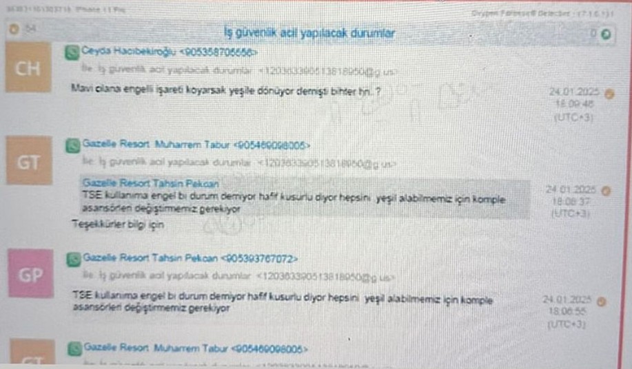 Tutuklu sanıklardan Gazelle Otel'in genel müdürü Ahmet Demir'in otel yangınından 3 gün sonra 'İş güvenlik acil yapılacak durumlar' isimli Whatsapp grubu kurduğu ve sadece 24 Ocak 2025 tarihinde yazışmaların yapıldığı ortaya çıktı.