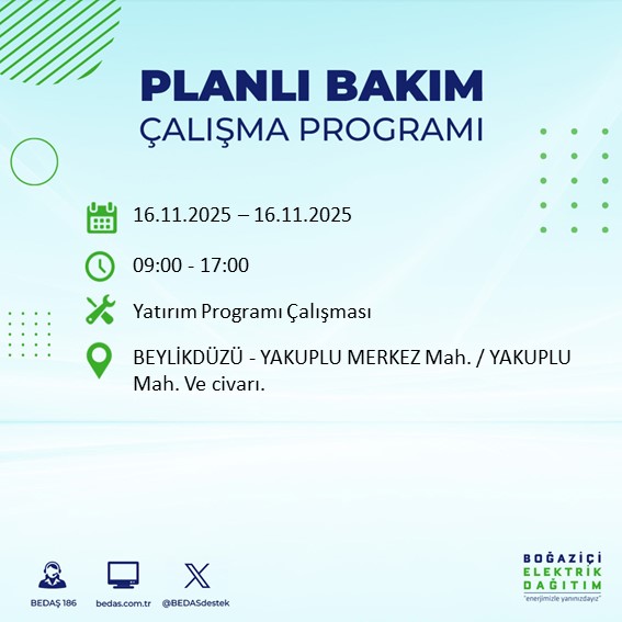 Kentteki planlı elektrik kesintilerine dair bilgilendirmeler her gün BEDAŞ'ın resmî internet sitesinde yayımlanıyor. Ancak 16 Kasım Pazar günü için açıklanan liste, özellikle uzun süreli bakım çalışmaları nedeniyle dikkat çekiyor. Bazı ilçelerde elektrik hizmetinin belirli saatler boyunca durdurulacağı belirtilirken, vatandaşların tedbirli olması gerektiği vurgulanıyor.