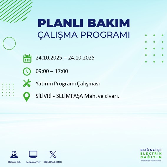 Boğaziçi Elektrik Dağıtım A.Ş. (BEDAŞ), İstanbul'un bazı bölgelerinde 24 Ekim Cuma günü bakım ve onarım çalışmaları nedeniyle elektrik kesintisi uygulanacağını açıkladı. Uzun süreli kesintiler bazı ilçelerde günlük yaşamı etkileyebilir, vatandaşlar alternatif planlar yapmaya davet ediliyor.