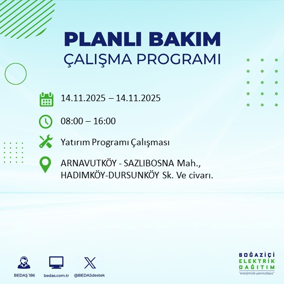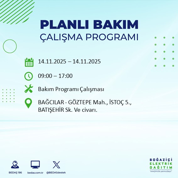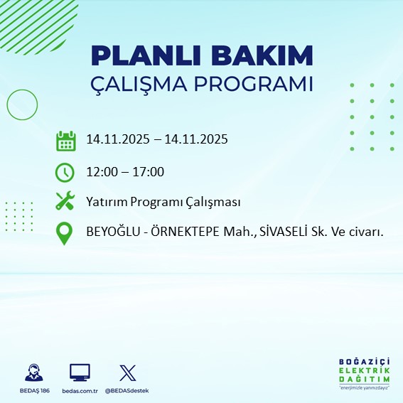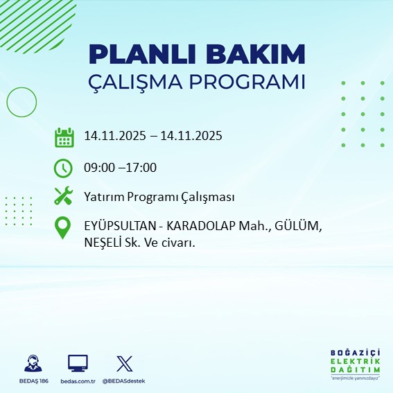 Boğaziçi Elektrik Dağıtım A.Ş. (BEDAŞ), İstanbul'un çeşitli bölgelerinde 14 Kasım Cuma günü planlı bakım ve onarım çalışmaları nedeniyle elektrik kesintisi uygulanacağını açıkladı. Şirket, kesintilerin yaşanacağı ilçe ve mahallelerin detaylı listesini resmi internet sitesinde paylaştı.