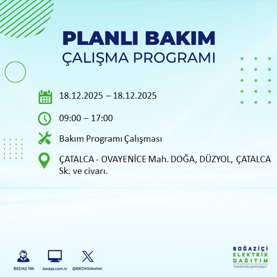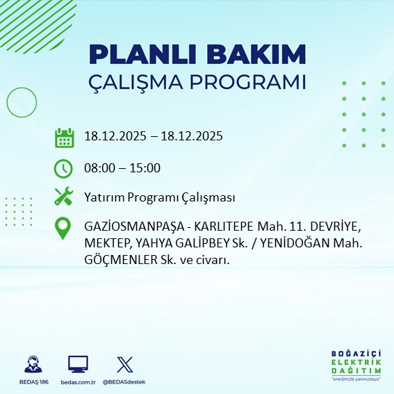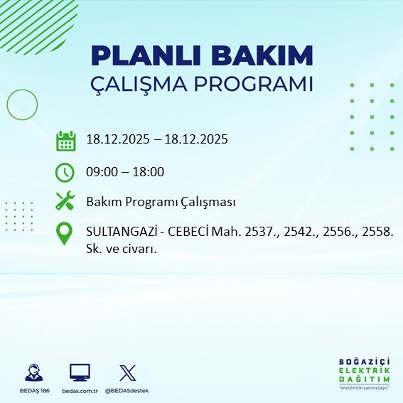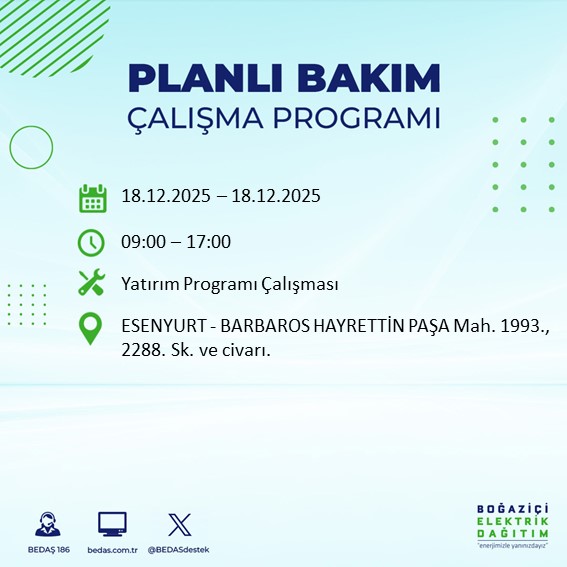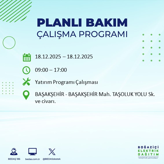 İstanbul'da planlanan elektrik kesintilerine ilişkin bilgilendirmeler, BEDAŞ tarafından her gün resmi internet sitesi üzerinden yayımlanıyor. 18 Aralık Perşembe günü yapılacak çalışmalar kapsamında, bazı ilçelerde uzun süreli kesintiler yaşanması bekleniyor.