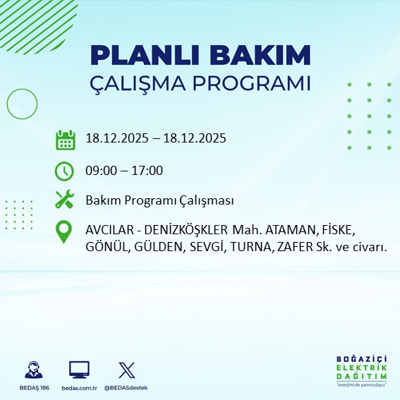 Boğaziçi Elektrik Dağıtım A.Ş. (BEDAŞ), İstanbul genelinde 18 Aralık Perşembe günü planlı bakım ve onarım çalışmaları nedeniyle bazı bölgelerde elektrik kesintisi uygulanacağını açıkladı. Kesintiden etkilenecek ilçe ve mahalleler kamuoyuyla paylaşıldı.