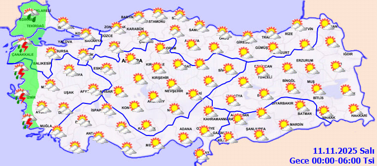 Meteoroloji Genel Müdürlüğü'nün son tahminlerine göre Türkiye'nin kuzey ve batı kesimleri parçalı bulutlu, yer yer sağanak yağışlı bir hafta sonuna hazırlanıyor. Edirne, Tekirdağ, Kırklareli, Çanakkale ve İzmir çevrelerinde kısa süreli gök gürültülü yağışlar beklenirken, diğer bölgelerde hava açık ve ılıman seyredecek.