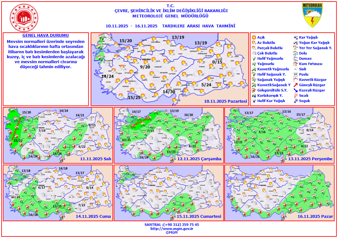 Hava sıcaklıklarında önemli bir değişiklik beklenmiyor. Türkiye genelinde sıcaklıklar kasım ortasında dahi mevsim normallerinin birkaç derece üzerinde ölçülmeye devam edecek. Meteoroloji uzmanları, güney kesimlerde gündüz sıcaklıklarının yer yer 25 dereceye yaklaşabileceğini belirtiyor.