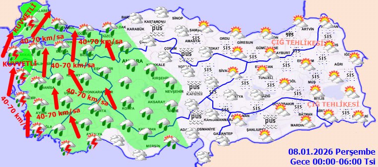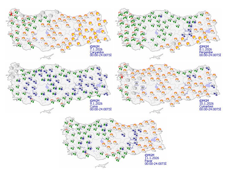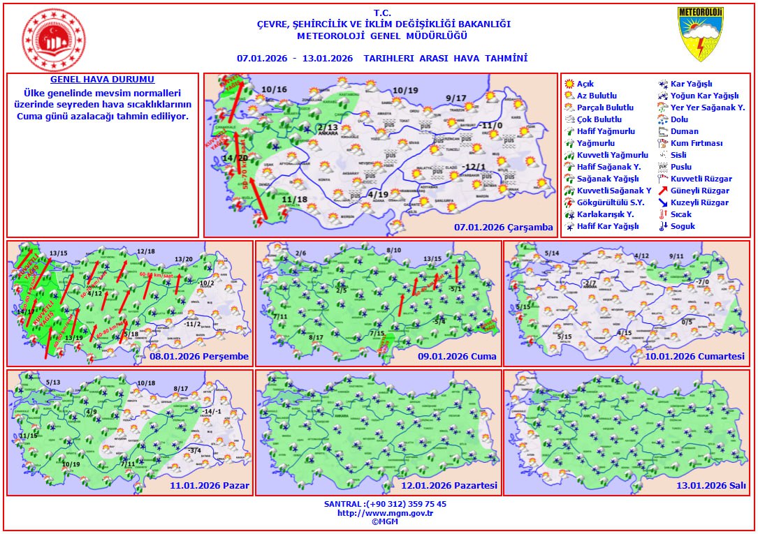 Meteoroloji Genel Müdürlüğü, yurt genelinde etkili olması beklenen yağışlı ve soğuk hava sistemi nedeniyle çok sayıda uyarı yayımladı. Marmara, Ege ve Batı Akdeniz başta olmak üzere birçok bölgede sağanak ve yer yer kuvvetli yağış beklenirken, Marmara ve Ege'de lodosun kısa süreli fırtına şeklinde esmesi öngörülüyor. İç ve doğu kesimlerde buzlanma ve don riski bulunurken, Doğu Karadeniz'in yüksekleri ile Doğu Anadolu'nun doğusunda çığ tehlikesine dikkat çekildi. İstanbul'da ise sıcaklıkların hızla düşmesiyle birlikte hafta sonu ve önümüzdeki hafta kar yağışı ihtimali gündemde.