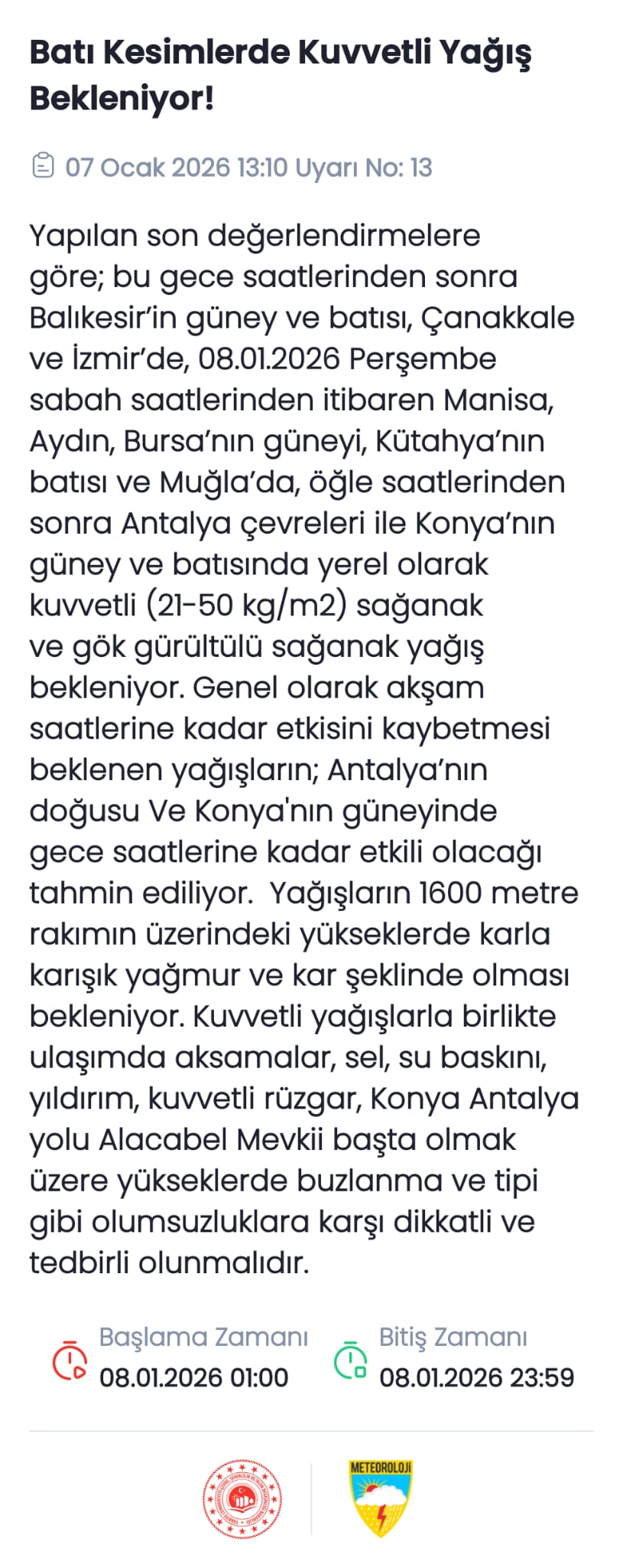 Yağışlı sistemin Orta Akdeniz üzerinden geldiğini belirten Adil Tek, sıcak cephe geçişiyle birlikte Ege'nin güney ve iç kesimlerinde çok kuvvetli yağış beklendiğini açıkladı. Muğla, Aydın, Denizli ve Isparta başta olmak üzere Uşak, Afyon ve Manisa çevrelerinde sel ve su baskını riskinin bulunduğunu belirten Tek, bu bölgelerde yaşayan vatandaşların dikkatli olması gerektiğini ifade etti.