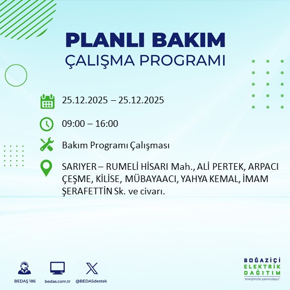 Boğaziçi Elektrik Dağıtım A.Ş. (BEDAŞ) ve AYEDAŞ İstanbul genelinde 25 Aralık Perşembe günü planlı bakım çalışmaları yapılacağını açıkladı. Bu kapsamda bazı ilçe ve mahallelerde gün boyu sürebilecek elektrik kesintileri yaşanacak. Detaylar resmi kaynaklarda paylaşıldı.