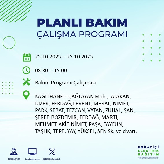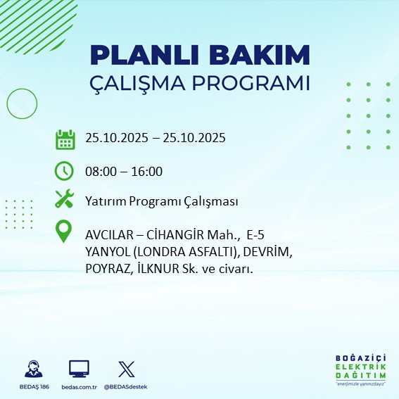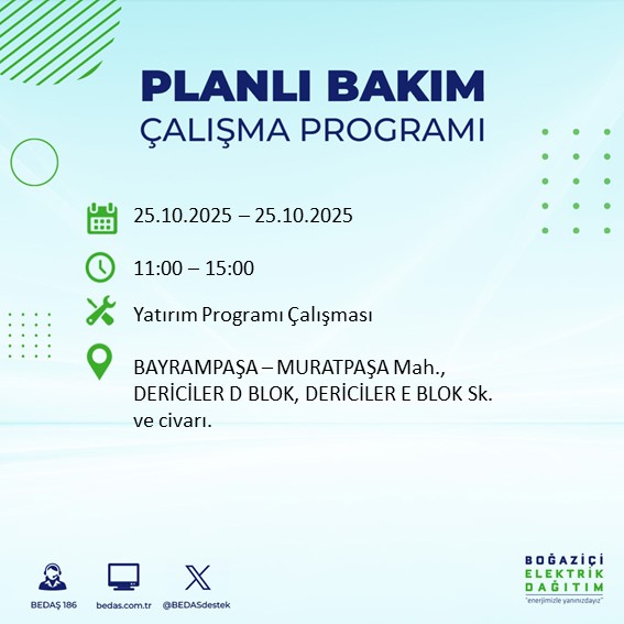 Kent genelinde yürütülen planlı kesinti duyuruları, her gün BEDAŞ'ın resmi internet sitesi üzerinden güncelleniyor. Ancak 25 Ekim Cumartesi yapılacak çalışmalar, özellikle bazı ilçelerde uzun süreli enerji kesintilerine neden olacağı için dikkat çekiyor.