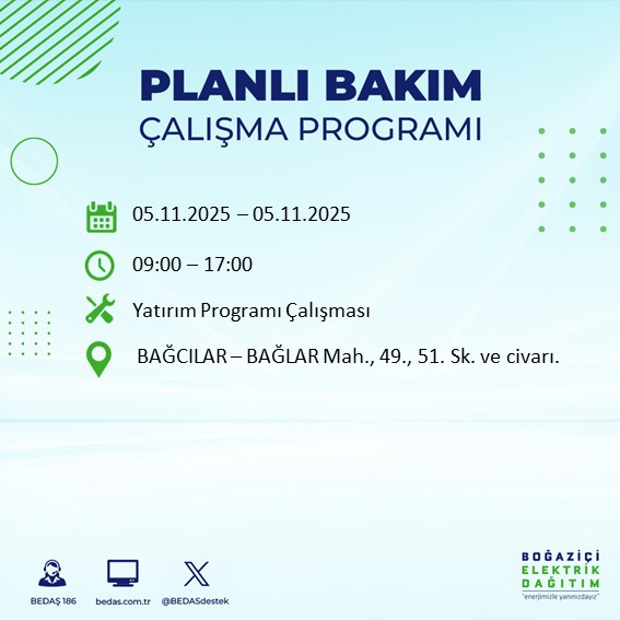 Boğaziçi Elektrik Dağıtım A.Ş. (BEDAŞ) ile Anadolu Yakası Elektrik Dağıtım A.Ş. (AYEDAŞ), İstanbul'un farklı noktalarında 5 Kasım Çarşamba günü planlı elektrik kesintileri uygulanacağını bildirdi. Şirketler, bakım ve onarım çalışmaları nedeniyle enerjinin geçici olarak kesileceği ilçe ve mahallelerin listesini kamuoyuyla paylaştı.