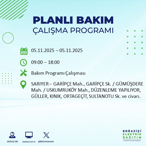 İstanbul genelinde yürütülen bakım faaliyetleri kapsamında yapılan bu kesintiler, BEDAŞ ve AYEDAŞ'ın resmi internet siteleri üzerinden düzenli olarak duyuruluyor. 5 Kasım tarihli planlamada ise özellikle uzun süreli bakım çalışmalarının yapılacağı bazı ilçelerde elektrik kesintilerinin etkili olması bekleniyor.