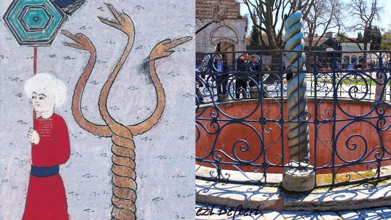 Afyoncu'nun yazısında yer alan bilgilere göre, bugün "Burmalı Sütun" diye bildiğimiz, Osmanlı kaynaklarında ise "Ejderha Heykeli" olarak geçen anıt, Pers savaşlarının ardından Yunan kolonilerinin zafer hatırası olarak diktiği üç başlı bronz yılandan oluşuyordu. Apollon Tapınağı'nın önünde yükselen bu sembol, İmparator I. Konstantin tarafından 324 yılında İstanbul'a getirildi ve Hipodrom'un merkezine yerleştirildi. Üstündeki altın kazan ise taşınma sırasında kayboldu.