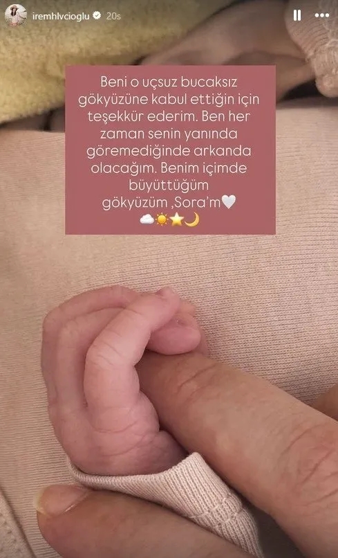 Helvacıoğlu, geçtiğimiz minik kızı Sora'nın elini tuttuğu anları paylaşarak, "Beni o uçsuz bucaksız gökyüzüne kabul ettiğin için teşekkür ederim. Beni her zaman senin yanında göremediğinde arkanda olacağım. Benim içimde büyüttüğüm gökyüzüm, Sora'm" notunu düşmüştü.