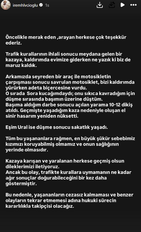 Geçtiğimiz günlerde bebeği Sora'yı kucağına alan oyuncu İrem Helvacıoğlu hayatının kabusunu yaşadı. Kadıköy'de yaşanan kazada savrulan araçlardan biri, kaldırımda eşi ve yenidoğan bebeğiyle yürüyen oyuncu İrem Helvacıoğlu'na çarptı. Kazaya ilişkin soruşturma başlatılırken ünlü oyuncu, dehşet anlarını anlattı. Kaza anı çevredeki güvenlik kamerasıyla görüntülendi.