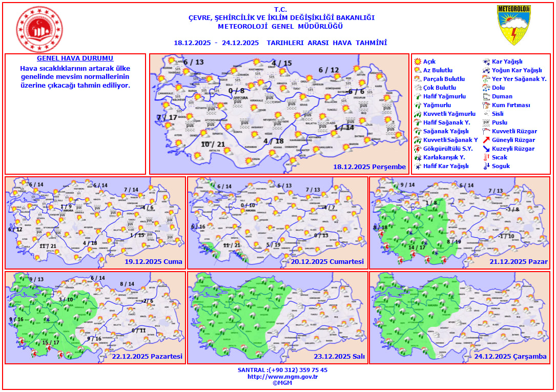 Sabah ve gece saatlerinde özellikle Marmara ile iç ve doğu bölgelerde pus ve yer yer sis görüleceği tahmin ediliyor. Hava sıcaklıklarının ülke genelinde mevsim normallerinin üzerinde seyretmesi beklenirken, rüzgarın genellikle kuzey yönlerden hafif, zaman zaman orta kuvvette esmesi öngörülüyor.