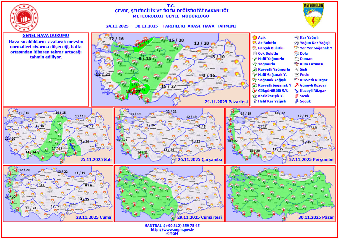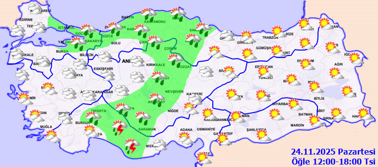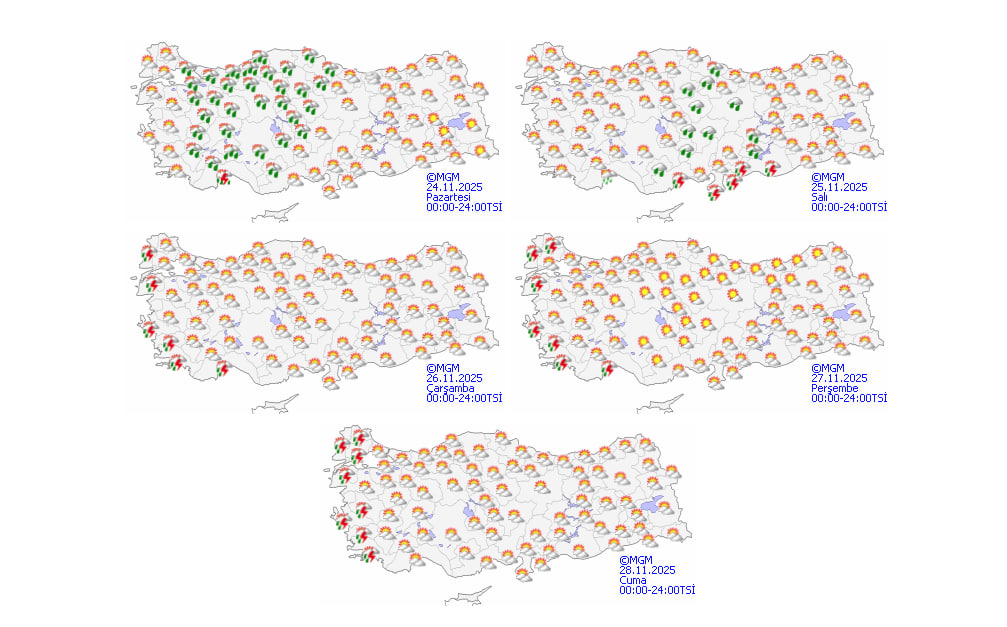 Meteoroloji Genel Müdürlüğü'nün son tahminleri, ülkenin kuzey, iç ve batı kesimlerinde bulutluluğun artacağını ve birçok bölgede sağanakların görüleceğini gösteriyor. Marmara'nın doğusu, İç Ege, Batı Akdeniz, İç Anadolu'nun büyük bölümü (Sivas hariç), Batı Karadeniz ile Samsun, Amasya ve Çorum çevrelerinde yağış geçişleri bekleniyor. Mersin'in batı ilçelerinde de zaman zaman gök gürültülü sağanakların etkili olacağı öngörülüyor.