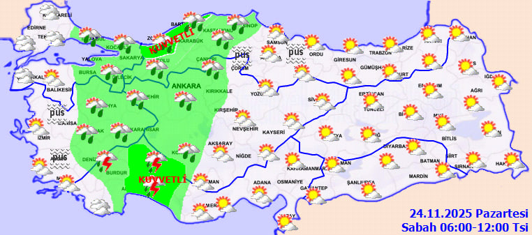 Tahminlere göre yağışlar, Muğla'nın doğusunda, Antalya ve Isparta çevrelerinde, ayrıca Düzce, Zonguldak ve Bartın'da yer yer kuvvetlenecek. Bu bölgeler için dikkatli olunması çağrısı yapıldı. Gece ve sabah saatlerinde ise Ege ile Batı ve Orta Karadeniz'in iç kesimlerinde pus ve sis görülebileceği belirtiliyor.