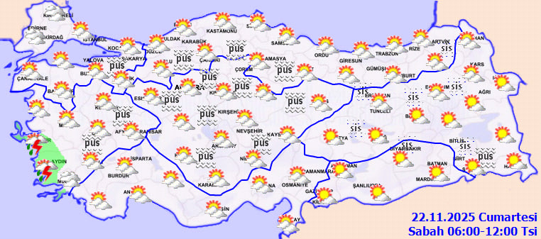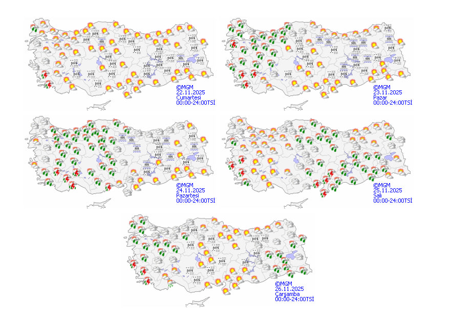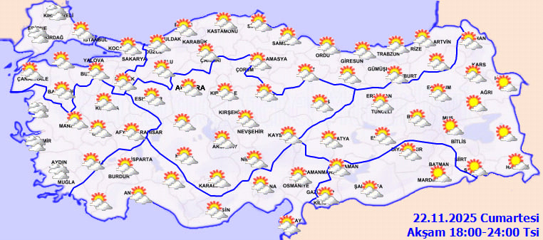 MGM'nin 22 Kasım tarihli değerlendirmesine göre, ülkenin kuzey, iç ve batı bölgelerinde parçalı ve yer yer çok bulutlu bir hava hakim olacak. Ege kıyıları, Balıkesir'in batısı ve Edirne çevrelerinde yerel sağanak ve gök gürültülü sağanak yağışların görülmesi bekleniyor. Diğer bölgelerde ise gökyüzü büyük ölçüde açık seyredecek.