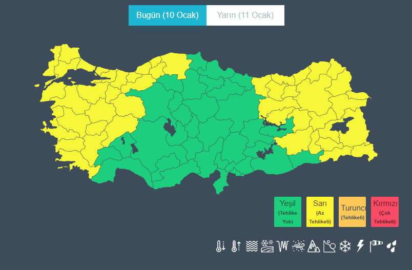 MGM'nin 10 Ocak tarihli hava durumu değerlendirmesine göre, lodos ve fırtına etkisini artırıyor. Marmara ve Ege'de kuvvetli yağış, iç ve doğu kesimlerde buzlanma ve don bekleniyor. İstanbul dahil çok sayıda il için sarı kodlu alarm verildi. İstanbul Valiliği'nin akşam saatlerinde başlayacağını belirttiği gök gürültülü sağanak yağışlar, şehir gelenlinde etkili oluyor. İşte detaylar...