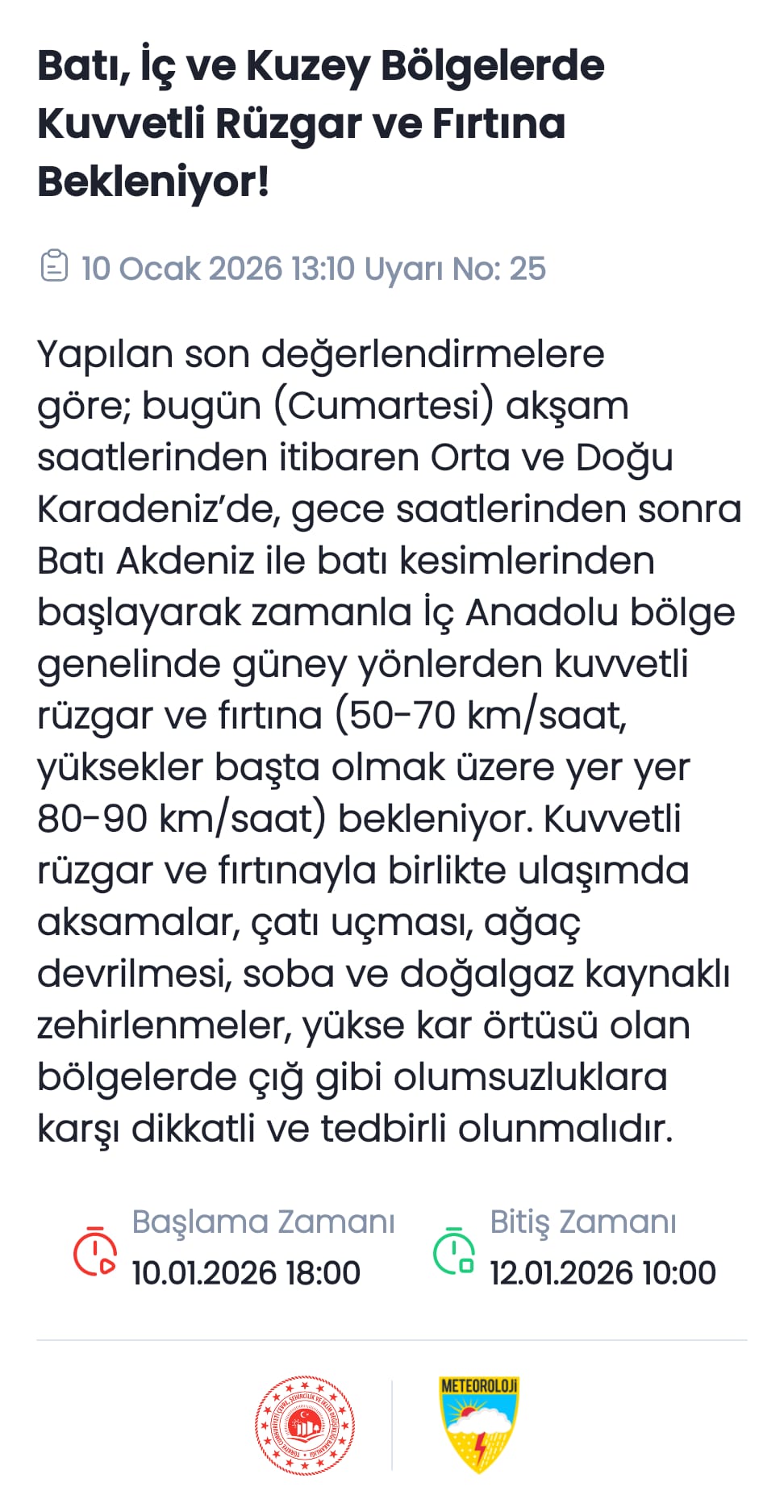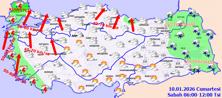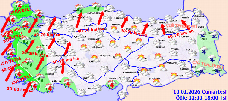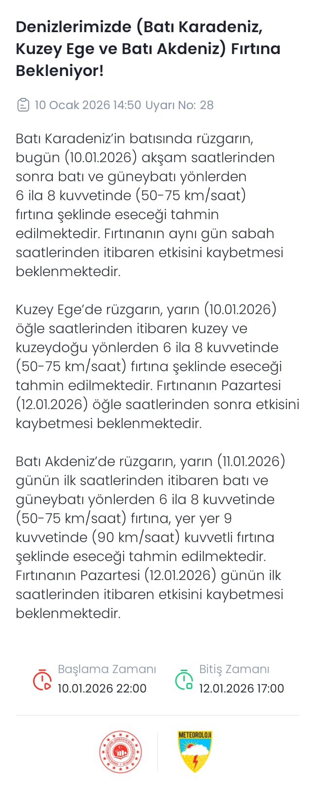 Meteorolojinin yaptığı paylaşıma göre Batı Karadeniz'in batısında rüzgarın 10 Ocak akşam saatlerinden sonra batı ve güneybatı yönlerden 6 ila 8 kuvvetinde (50-75 km/saat) fırtına eseceği tahmin ediliyor. Kuzey Ege'de rüzgarın bugün öğle saatlerinden itibaren fırtına etkisi görüleceği belirtiliyor. Batı Akdeniz'de ise 11 Ocak Pazar gününün ilk saatlerinden itibaren (50-75 km/saat) fırtına, yer yer 9 kuvvetinde (90 km/saat) kuvvetli fırtına şeklinde esmesi bekleniyor.