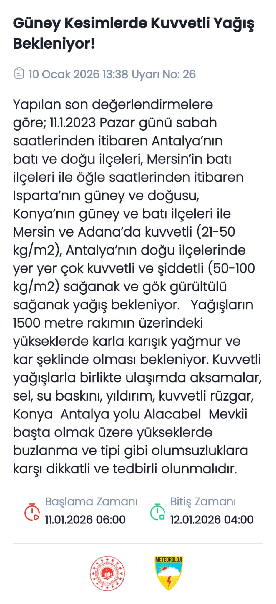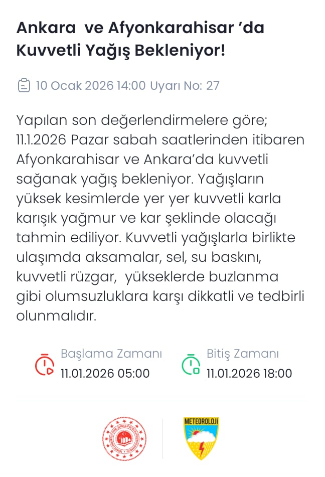 Meteoroloji tarafından paylaşıma göre 11 Ocak Pazar sabah saatlerinden itibaren Ankara ve Afyonkarahisar'da kuvvetli yağış bekleniyor. Bu yağışların yüksek kesimlerde yer yer kuvvetli karla karışık yağmur ve kar şeklinde olacağı ifade ediliyor.