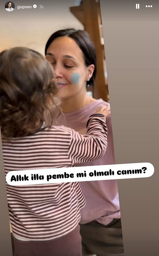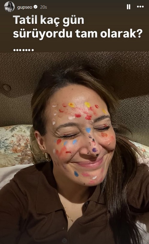 Gupse Özay'dan gülümseten paylaşım! Meslektaşı Barış Arduç'la 2020 yılından bu yana evli olan Gupse Özay, minik kızı Jan Asya ile oynadığı oyun sonrası yüzünün boyanmış halini takipçileriyle paylaştı. Ünlü oyuncu, "tatil kaç gün sürüyordu?" diyerek tatlı bir sitemde bulundu.