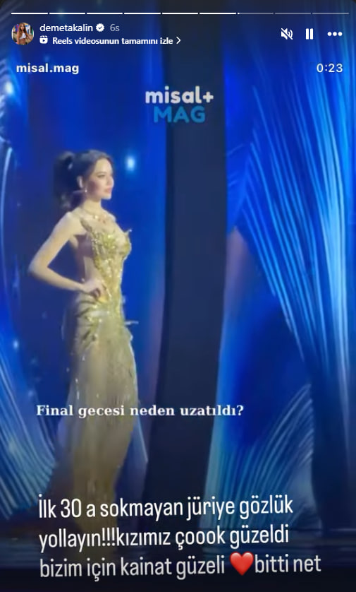 Ceren Arslan'ın Miss Universe hazırlık sürecine tamamen kendi imkanlarıyla devam ettiği, yanında profesyonel bir makyöz ya da saç tasarımcısı bulunmadığı yönündeki iddialar da gündemde yer almıştı. Bu söylentilerin ardından devreye giren Demet Akalın, dikkat çeken bir destek mesajı paylaştı. Arslan'ın yanında olduğunu göstererek, "İşte güzel, işte Türkiye Güzeli! Oh be!" sözleriyle milli temsilciye açık bir destek verdi.