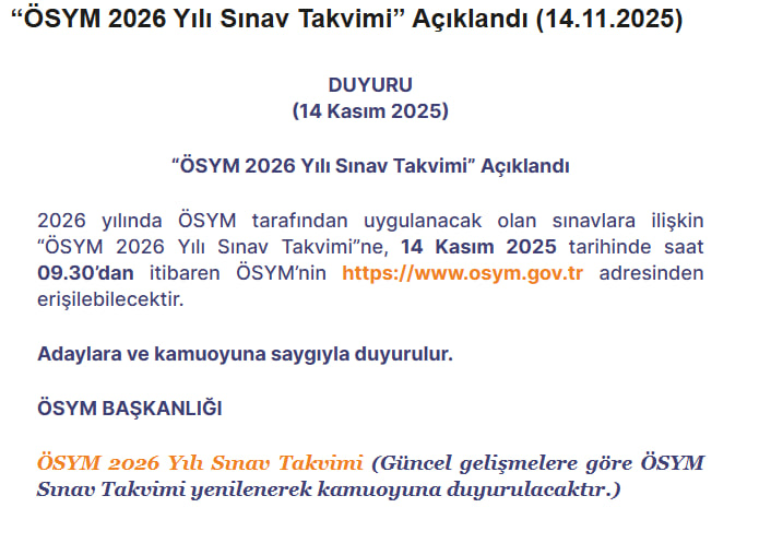 ÖSYM tarafından yapılan açıklamaya göre, 2026 yılında ÖSYM tarafından uygulanacak olan sınavlara ilişkin "ÖSYM 2026 Yılı Sınav Takvimi"ne, 14 Kasım 2025 tarihinde saat 09.30'dan itibaren ÖSYM'nin https://www.osym.gov.tr adresinden erişilebilecek.
