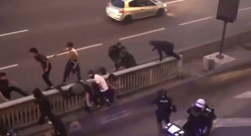 Bazı taraftarlar, polisten kaçmak için, güvenlik şeridini aşarak yola atladı.