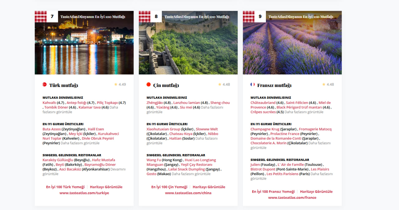 Türkiye, bu yıl da üst sıralardaki yerini korudu. Türk mutfağı, 4.49 puanla listenin yedinci basamağına yerleşti. Anadolu'nun geniş lezzet birikimi değerlendirmelerde güçlü bir etki yarattı.