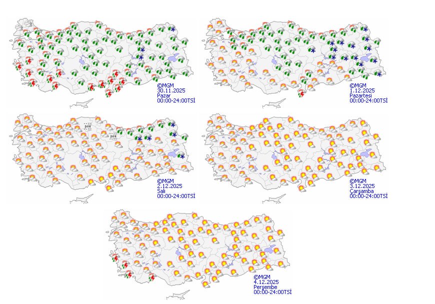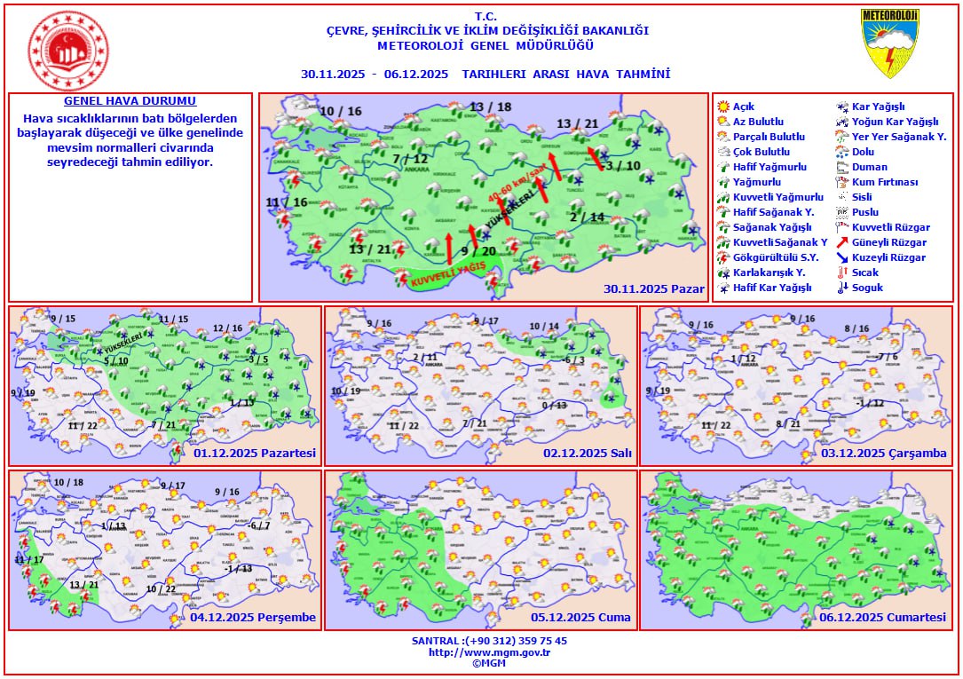 Meteoroloji Genel Müdürlüğü'nün son değerlendirmelerine göre hafta boyunca yurdun büyük bölümü yağışlı hava etkisi altına giriyor. Ülke genelinde parçalı ve çok bulutlu gökyüzü hakim olacak; Marmara'nın güney ve doğusu, Ege, Akdeniz, İç Anadolu, Batı Karadeniz, Orta ve Doğu Karadeniz'in iç kesimleri, Doğu Anadolu'da Van hariç geniş bir alan ile Güneydoğu Anadolu'da Mardin hariç birçok noktada yağış bekleniyor.