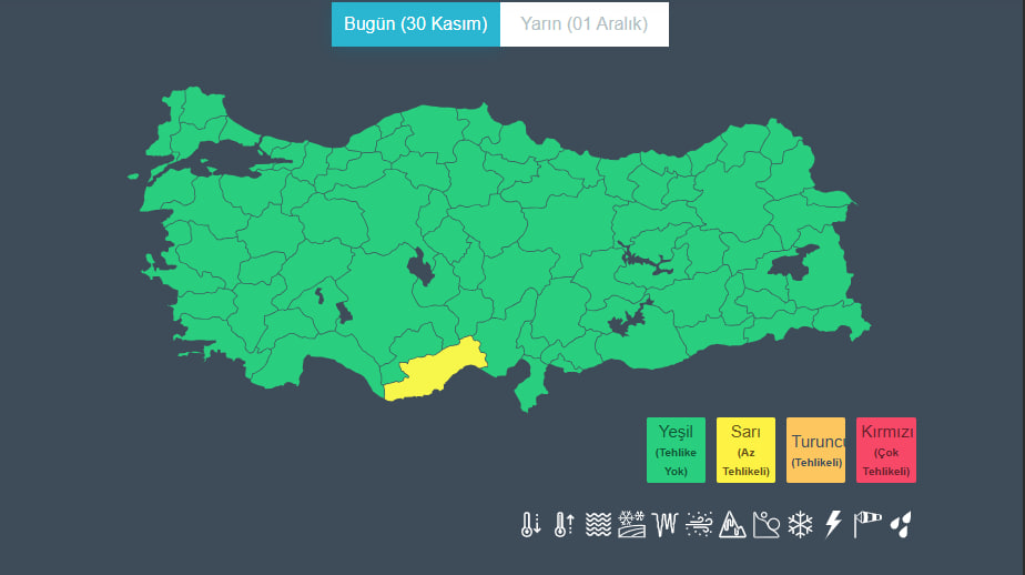 Özellikle Akdeniz'de riskin arttığı belirtiliyor. Mersin ve Adana çevreleri ile Hatay'ın kıyı bölgelerinde yağışların kuvvetlenmesi bekleniyor. Bu nedenle bölgede su baskını, ani sel, yıldırım, yerel dolu, ulaşımda aksama ve yağış anında etkili rüzgâr gibi olası olumsuzluklara karşı dikkatli olunması istendi.