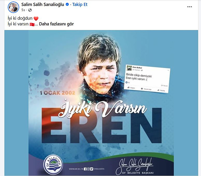 Ruhun şad olsun', 'İyi ki varsın Eren, doğum günün kutlu olsun', 'İyi ki varsın Eren, bu millet seni asla unutmayacak', yorumlarıyla sayfalarında paylaşıp, kutlama ve anma mesajları yayımladı.