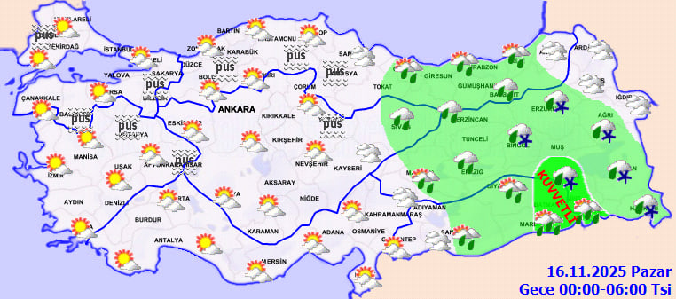 Güneydoğu Anadolu'da Diyarbakır ve Şanlıurfa çevrelerinde yağışların yağmur şeklinde devam ettiğini belirten Tek, batı bölgelerde yağışların kesildiğini ancak sistemin orta ve doğu bölgelerde etkisini sürdürdüğünü vurguladı.