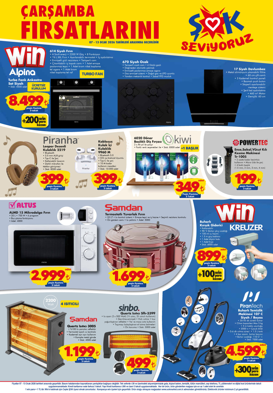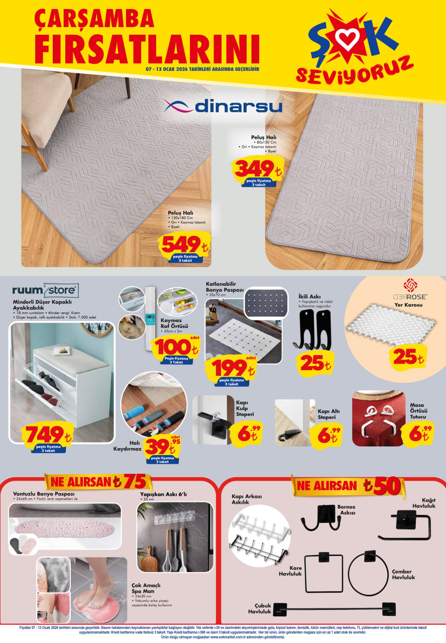 ŞOK Marketler, 7–13 Ocak tarihlerini kapsayan yeni aktüel ürün kataloğunu duyurdu. Bu hafta Columbia mont ve yağmurluklar öne çıkarken; ayakkabılık, peluş halı, katlanabilir banyo paspası, ankastre set, mikrodalga fırın, ısıtıcı ve birçok ürün raflarda olacak.