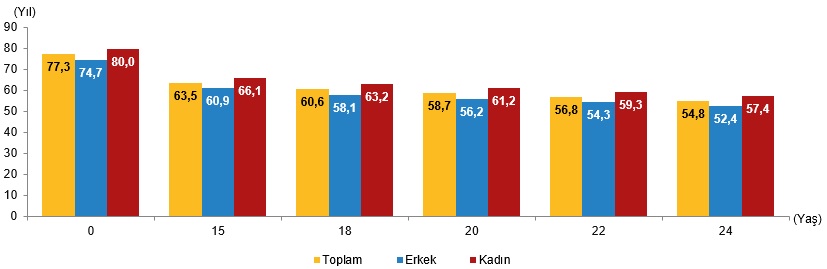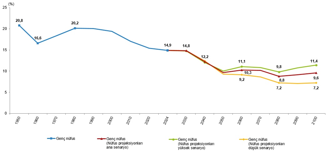2024 yıl sonu itibarıyla Türkiye nüfusu 85 milyon 664 bin 944 kişiye ulaşırken, 15-24 yaş grubundaki genç nüfus 12 milyon 763 bin 159 kişi olarak kayıtlara geçti. Bu, ülkenin toplam nüfusun %14,9'unu oluşturuyor. 1950 yılında %20,8 olan bu oran, yıllar içinde düşüşe geçti. TÜİK'te yer alan istatistiklere göre bu eğilimin 2100'e dek azalarak devam edeceği ve %9,6 seviyesinde olacağı tahmin ediliyor.