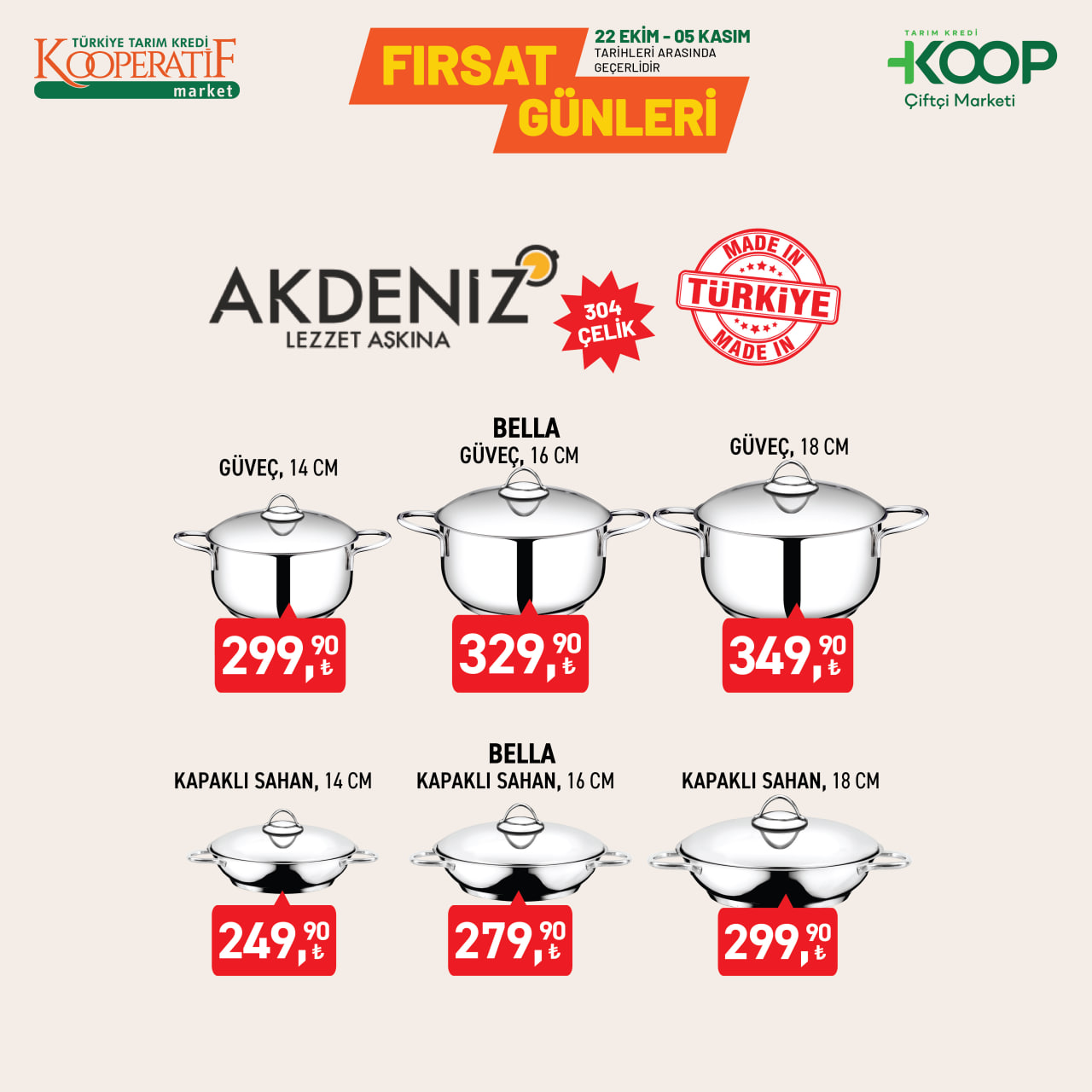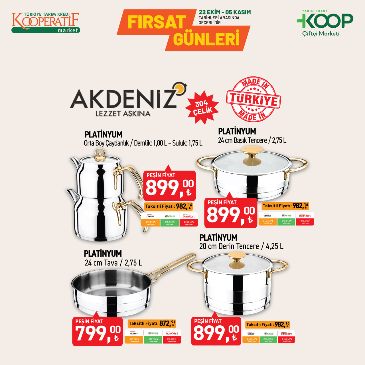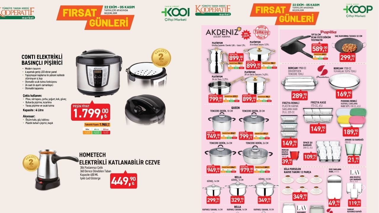 Tarım Kredi KOOP Çiftçi Marketleri, sonbahar indirimlerini başlattı. 22 Ekim - 5 Kasım 2025 tarihleri arasında geçerli kampanyada çelik tencerelerden döküm tost makinesine, cam saklama kaplarından porselen takımlara kadar birçok üründe büyük indirimler sunuluyor. Uygun fiyatlı mutfak ürünleriyle alışverişini yenilemek isteyenler için kaçırılmayacak fırsatlar market raflarında yerini aldı.
