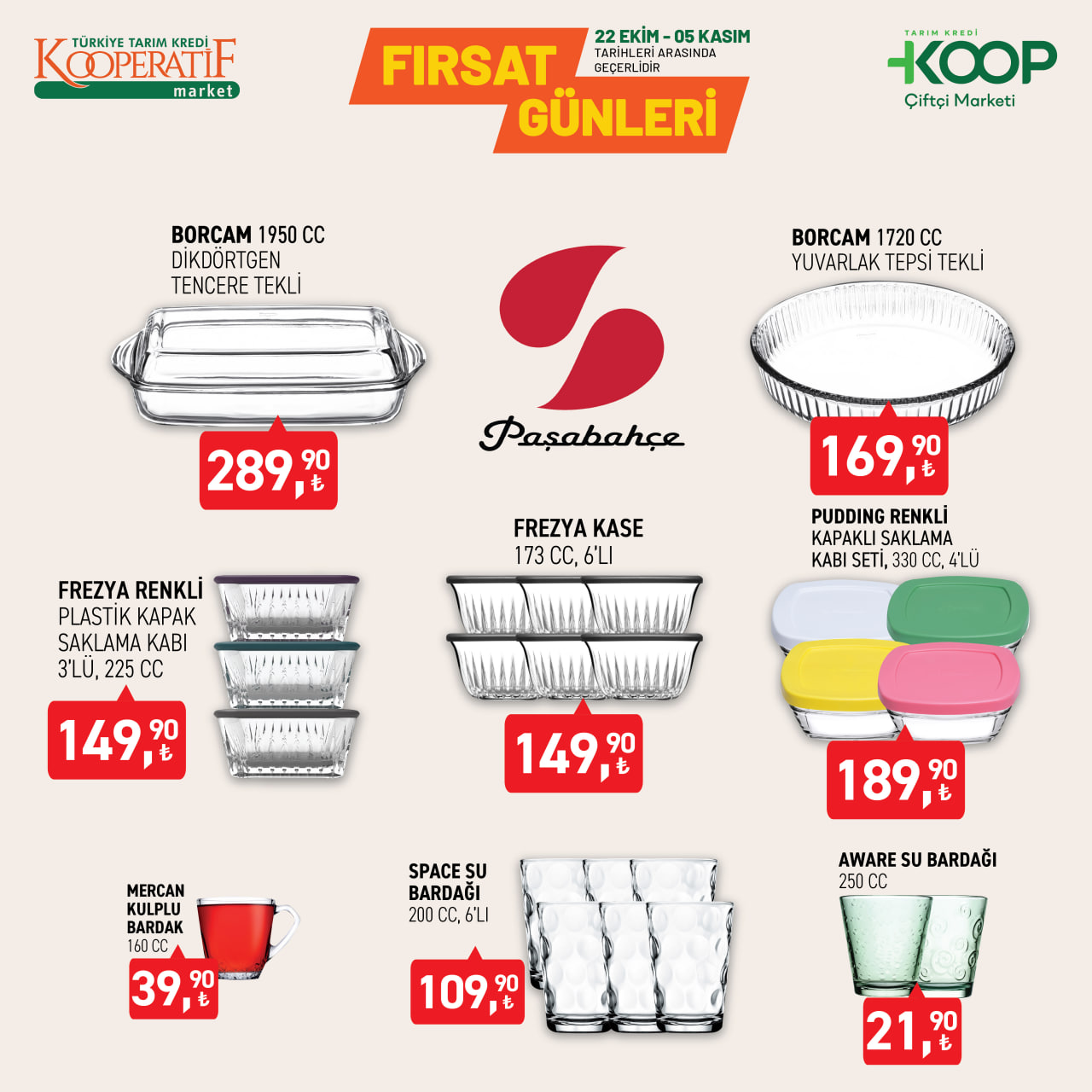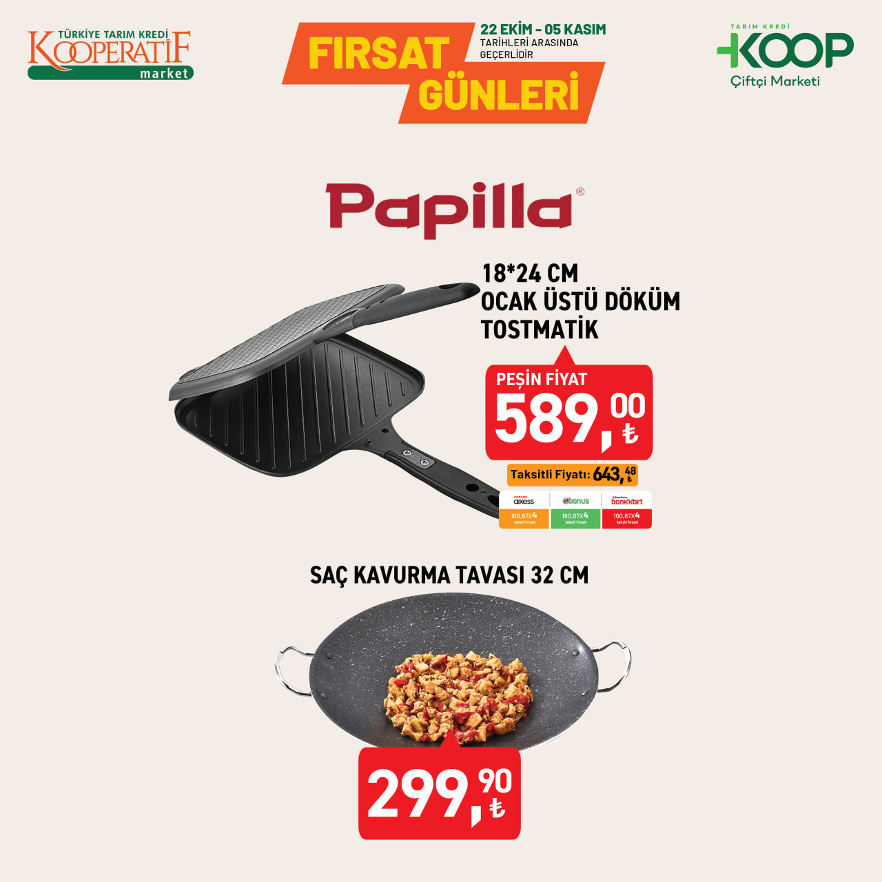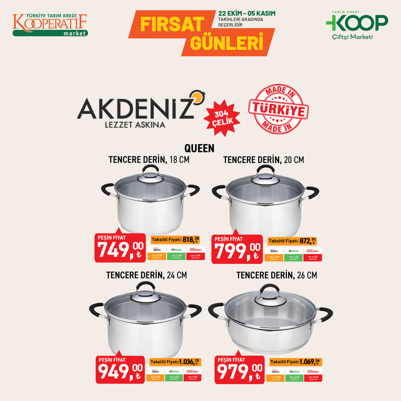 Tarım Kredi KOOP Çiftçi Marketleri, sonbahar indirimlerini başlattı. 22 Ekim - 5 Kasım 2025 tarihleri arasında geçerli kampanyada çelik tencerelerden döküm tost makinesine, cam saklama kaplarından porselen takımlara kadar birçok üründe büyük indirimler sunuluyor. Uygun fiyatlı mutfak ürünleriyle alışverişini yenilemek isteyenler için kaçırılmayacak fırsatlar market raflarında yerini aldı.