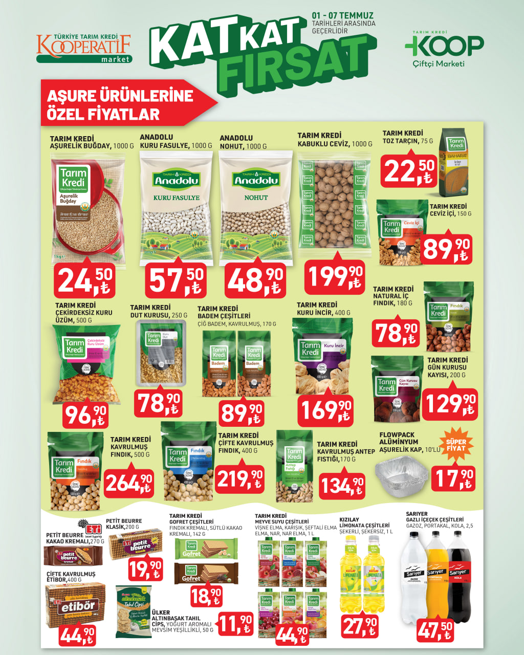 Tarım Kredi Market Muharrem ayının paylaşma, bereket ve dayanışma ruhunu desteklemek için özel indirim kampanyası başlattı. Aşure hazırlığında kullanılan nohut, buğday, kuru fasulye, kuru kayısı, incir, ceviz, fındık, tarçın ve şeker gibi temel malzemelerde cazip fiyatlarla sunuluyor. İşte 1-7 Temmuz kataloğu...