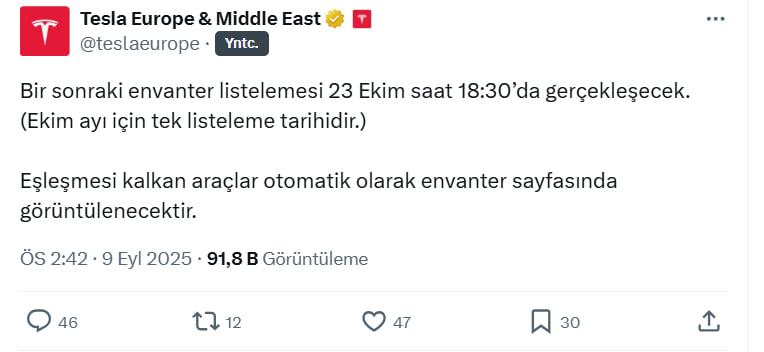 Tesla, sosyal medya hesabından yaptığı paylaşımda 2025 yılı Ekim ayı için envanter listeleme tarihini 23 Ekim 2025 olarak duyurdu. Açıklamaya göre, eşleşmesi kalkan araçlar 23 Ekim saat 18.30'da otomatik olarak envanter sayfasında görüntülenecek.