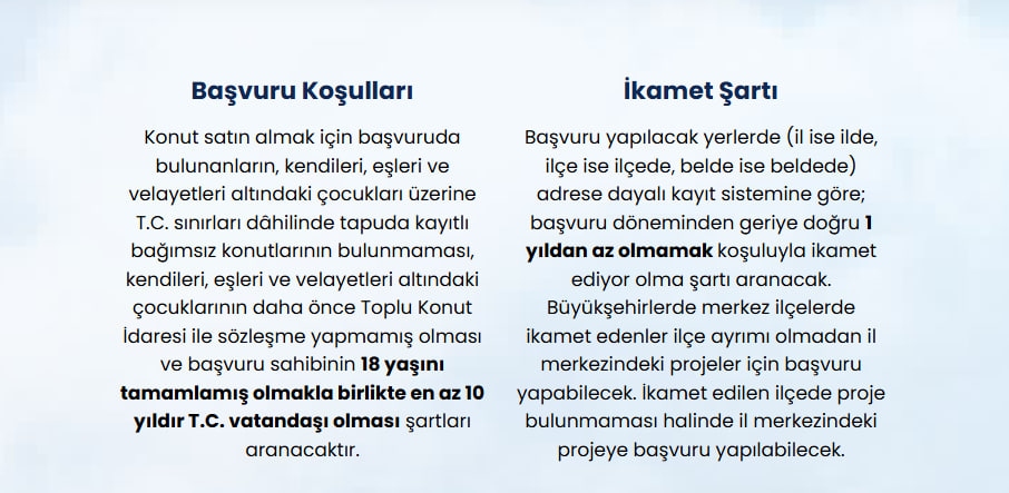 Faruk Erdem'in açıklamasına göre, sosyal konut projesine başvurabilmek için bazı temel şartlar bulunuyor. En başta 18 yaşını doldurmuş ve Türkiye Cumhuriyeti vatandaşı olmak gerekiyor. Ancak burada dikkat çeken bir detay var: En az 10 yıldır Türkiye Cumhuriyeti vatandaşı olanlar başvuruda bulunabilecek.
