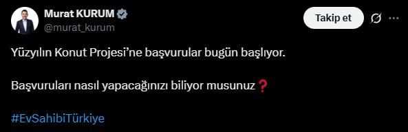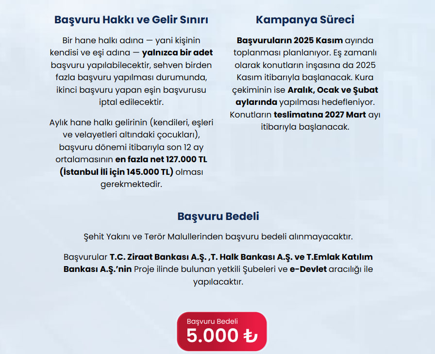 Ayrıca başvuru sahibinin 24 Ekim 2025 itibarıyla üzerine kayıtlı bir konut tapusu bulunmaması şartı aranıyor. Bu tarih özellikle hileli tapu devirlerinin önüne geçmek için belirlenmiş durumda. Erdem bu konuda, "Projeyle amaç, ilk kez ev sahibi olacak vatandaşları desteklemek. Yani beş-on evi olanların değil, gerçekten dar gelirli, sabit gelirli vatandaşın ev sahibi olması hedefleniyor" dedi.