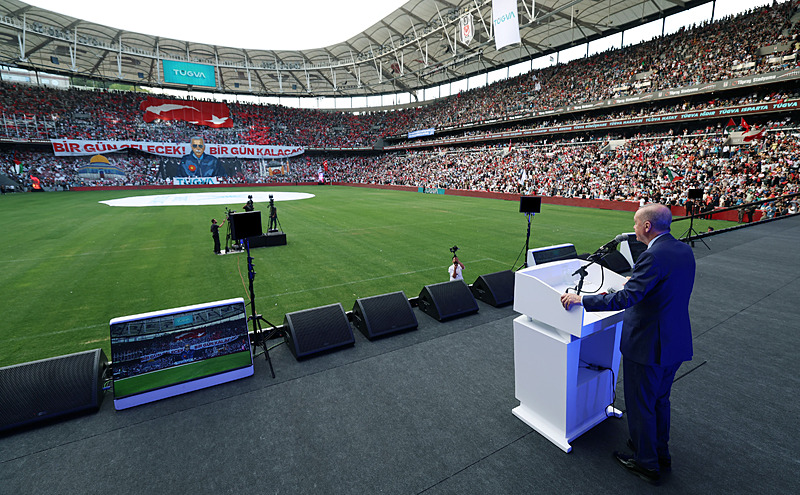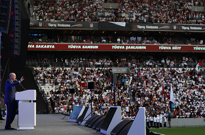 Programa yoğun katılım sağlayan binlerce genç, ellerinde Türk bayraklarıyla Başkan Erdoğan'a sevgi gösterisinde bulundu. Erdoğan'ın konuşmasından önce tribünlerde açılan dev koreografi dikkat çekti. Pankartta, Mescid-i Aksa ve Ayasofya görselleri ile Başkan Erdoğan'ın portresi yer aldı. Stadyum tribünlerinde açılan dev pankartta ise "Bir Gün Gelecek! Bir Gün Kalacak!" ifadesi yer aldı.