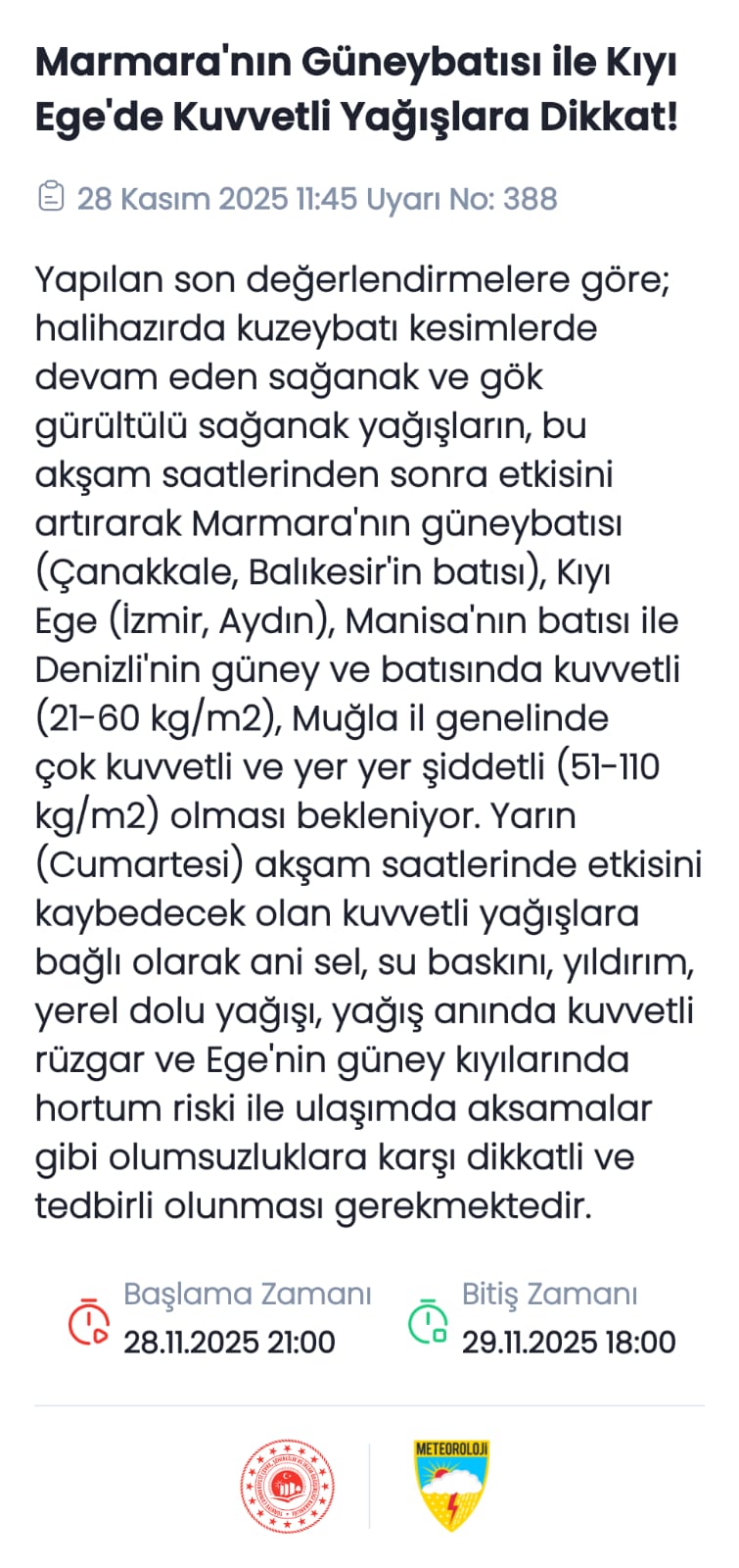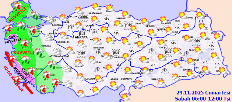 Yağışların özellikle Marmara'nın batısında, Ege Bölgesi'nde (Kütahya dışında), Batı Akdeniz'de ve Mersin çevresinde kuvvetli, Ege'nin güney kıyıları ile Edremit Körfezi çevresinde ise yer yer çok kuvvetli seviyeye ulaşacağı tahmin ediliyor.
