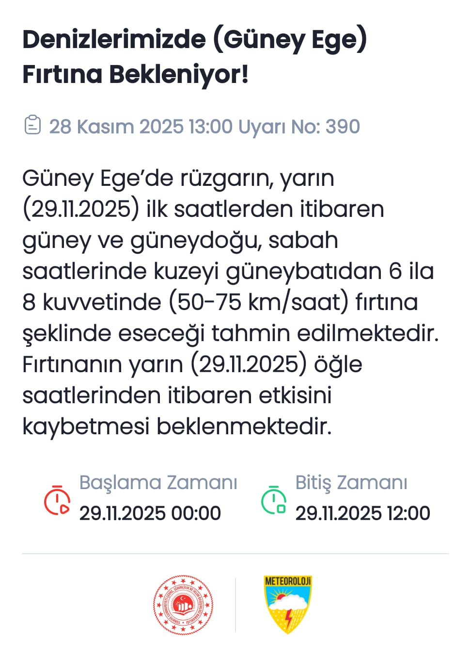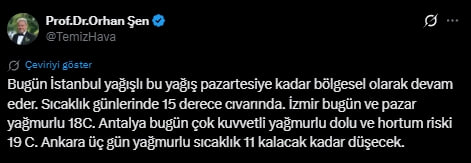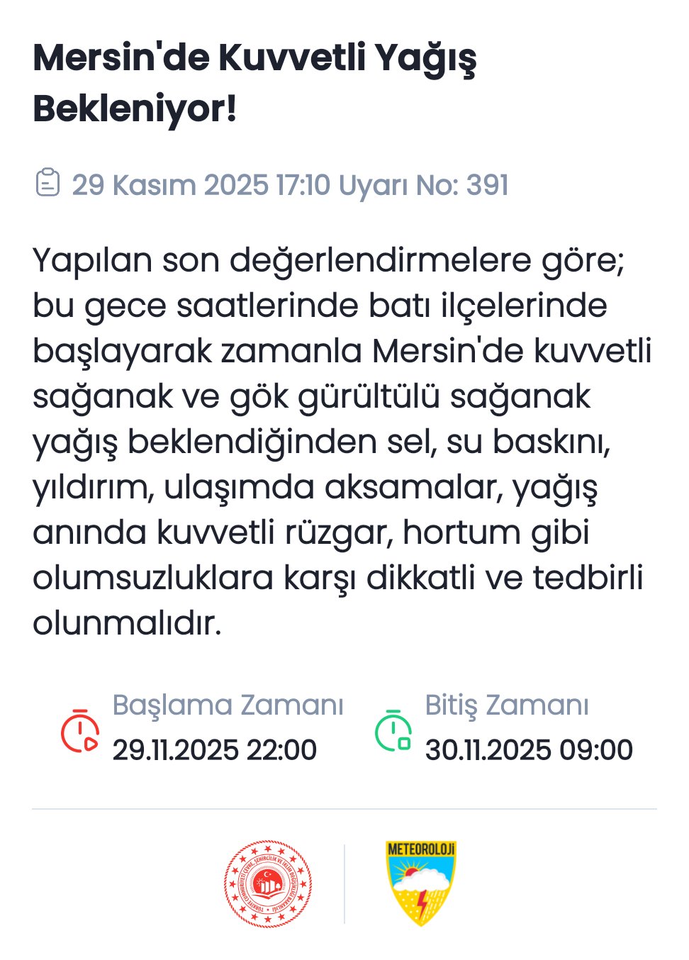 "Yapılan son değerlendirmelere göre; bu gece saatlerinde batı ilçelerinde başlayarak zamanla Mersin'de kuvvetli sağanak ve gök gürültülü sağanak yağış beklendiğinden sel, su baskını, yıldırım, ulaşımda aksamalar, yağış anında kuvvetli rüzgar, hortum gibi olumsuzluklara karşı dikkatli ve tedbirli olunmalıdır."